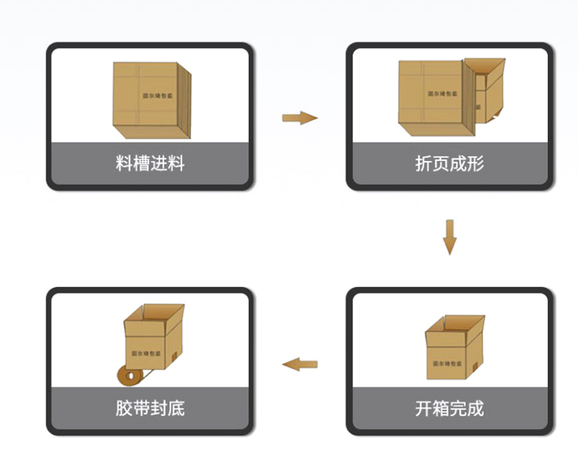这款设备的核心价值,在于将复杂的开箱流程简化为一个按键。操作人员只需将成摞的纸板放入料仓,按下启动键,后续所有动作——包括纸板吸取、自动开箱、侧面折合、底部封胶,全部由机器一气呵成。整个过程无需人工干预,真正实现了从纸板到成型纸箱的自动化转变。